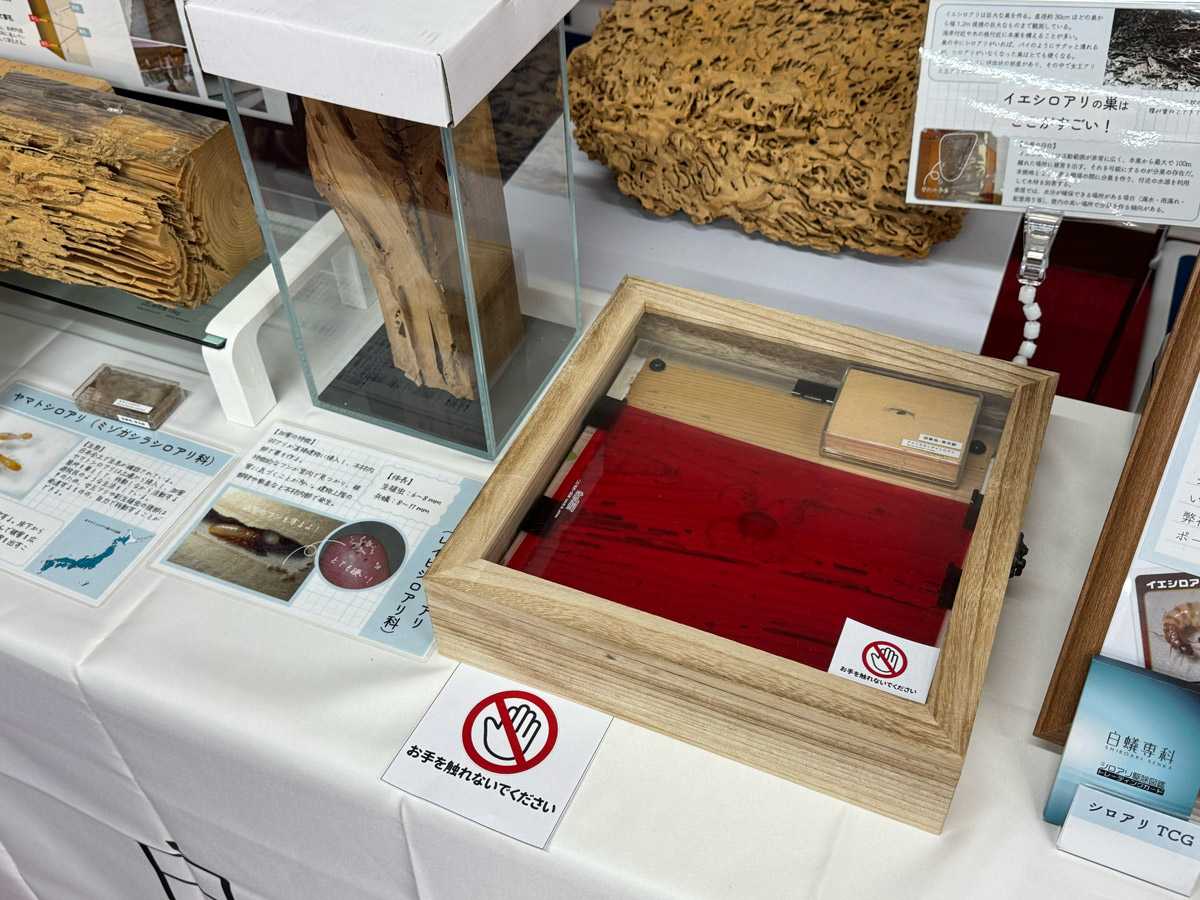 当日はトークショーだけでなくブースも出展し、シロアリ被害の実態や今話題のアメリカカンザイシロアリについてのパネル展示、生体展示を実施。さらにリアルアクリルスタンドやシール、トレーディングカードと、ここでしか買えない珍グッズも販売しちゃいました。